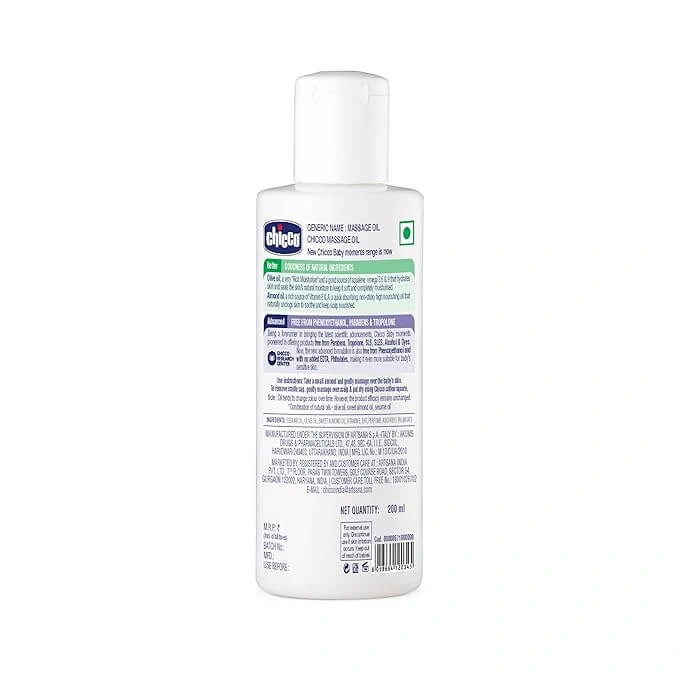- Ultra-Rich Nourishing Oil: The all new Chicco Baby Moments Massage Oil deeply moisturizes baby’s dry skin areas and provides rich moisturization for all-day soft skin. The oil also nourishes baby’s scalp, keeping hair silky and shiny