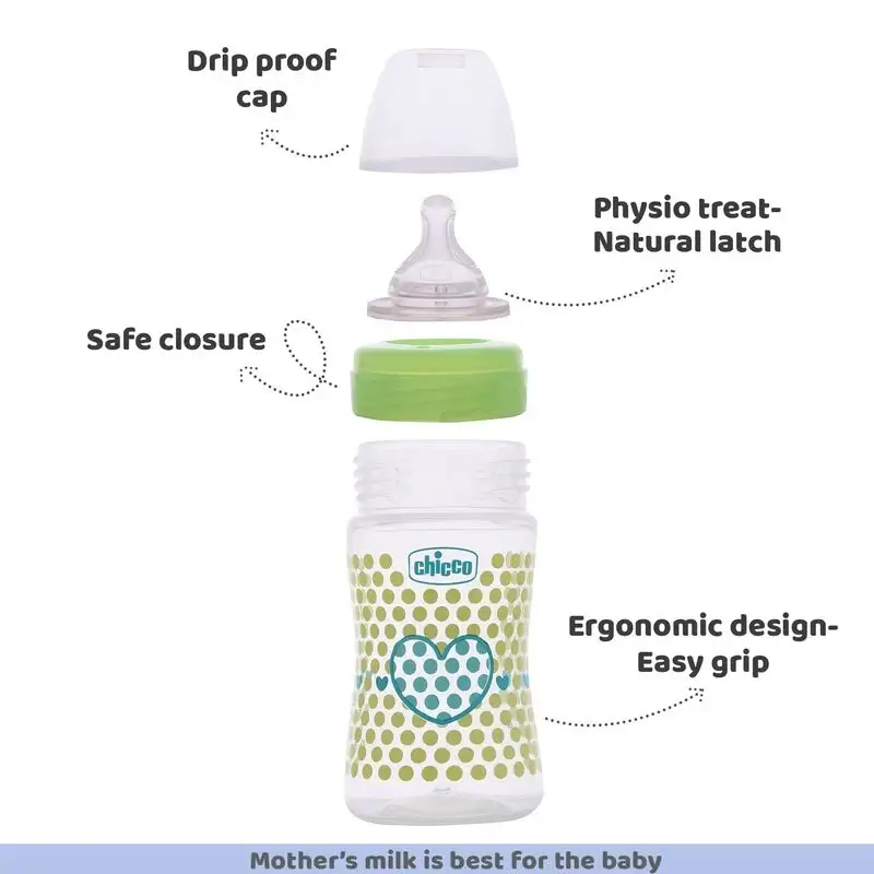 - Chicco Well-Being Feeding Bottles are especially designed to provide the baby with a comfortable and relaxed feeding experience. It helps protect your baby from colic, hiccups, regurgitation (spitting-up), and irritability